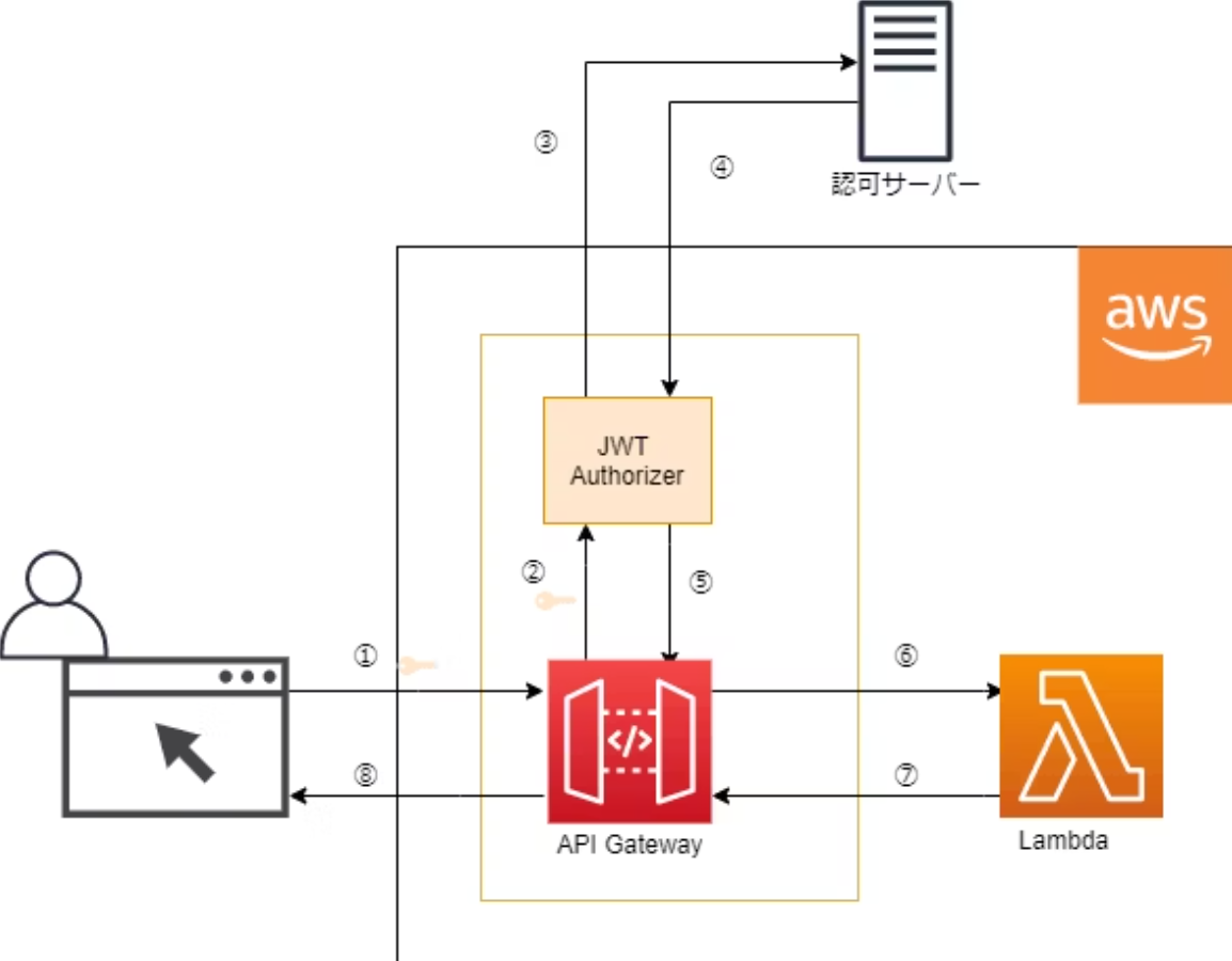 - AWS JWT Authorizerは認証サービス (図では認可サーバー) から検証に使用する公開鍵を取得する。
