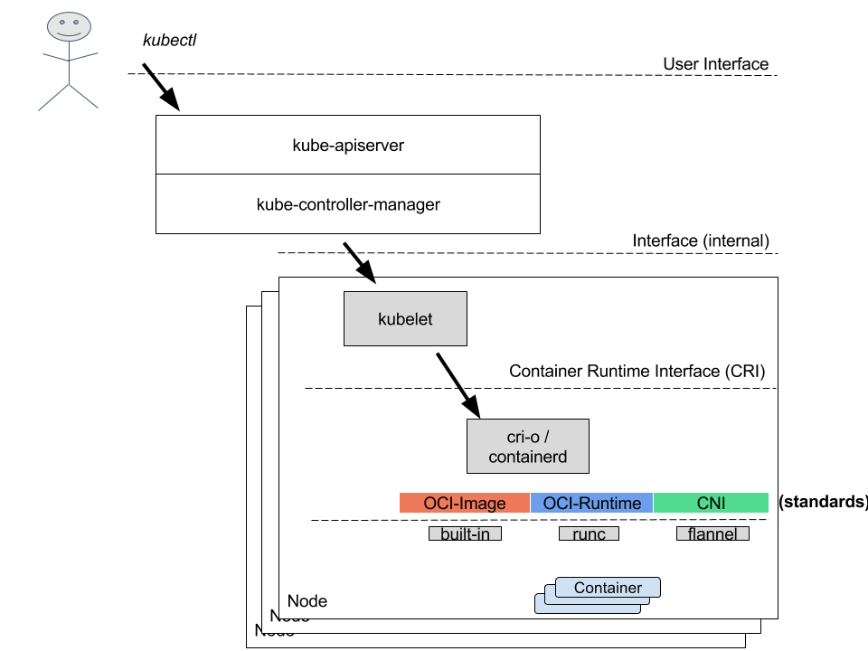 OCIランタイム (例:runC) と単一/複数のCNIプラグイン (例:flannel) のバイナリを実行し、コンテナを起動する。